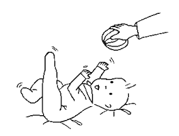 - Colocarle cerca de las palmas objetos, para que al contacto con sus palmas los agarre, no buscamos que él busque el objeto y lo coja, sino que lo agarre al contacto.